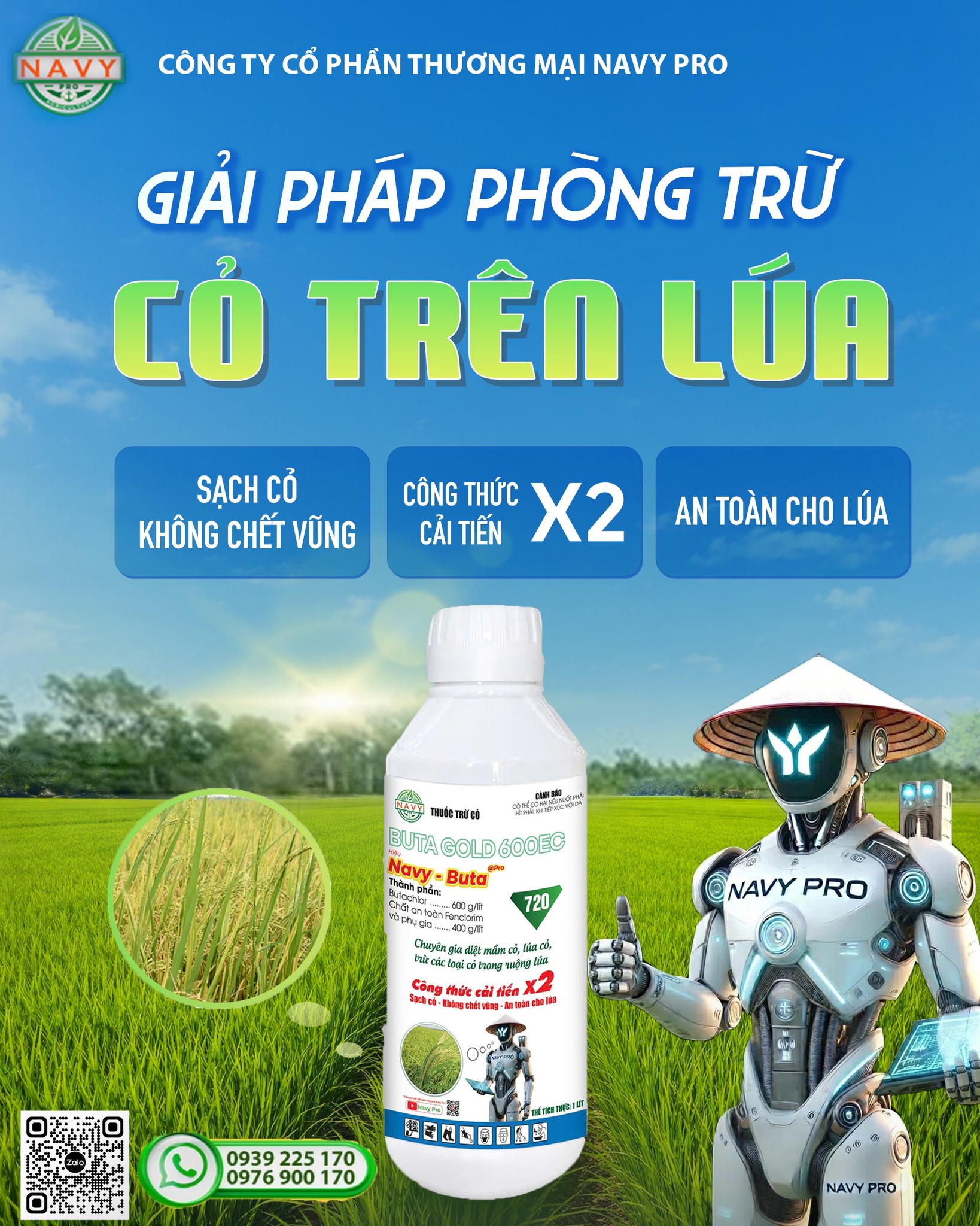 Bên cạnh biện pháp thủ công như nhổ bỏ sớm và tránh để hạt rụng xuống đất, bà con có thể tham khảo và sử dụng sản phẩm Navy Buta Pro 600EC - hỗ trợ xử lý nhanh gọn, sạch cỏ mà vẫn an toàn cho cây trồng!